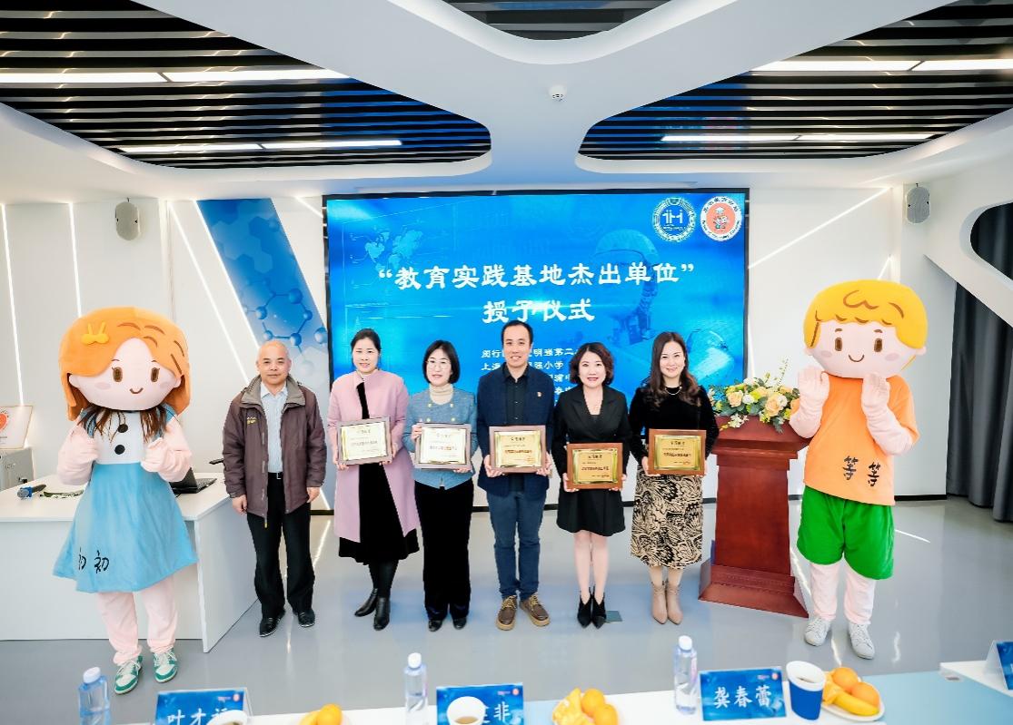 上海师范大学天华学院校长叶才福为闵行区七宝明强第二小学、上海七宝明强小学、上海市宝山区月浦中心校、上海市普陀区朝春中心小学和嘉定青少年科创集散地颁发“教育实践基地杰出单位”荣誉称号。