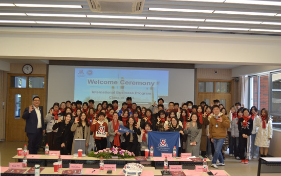 2023年12月1日, 2023级国际商务 (国际课程合作) 专业美方开学典礼隆重举行,亚利桑那大学(The University of Arizona,UA)国际录取招生主任Katie Van Wyk、亚利桑那大学中国中心主任Peter Zhang等莅临现场,与23级国际商务专业(国际课程合作)专业的51名新生见面。我校商学院副院长蒋亚萍、国际交流处处长胡珍、老师赵诗佳及国际商务(国际课程合作)专业负责人孙艳艳及辅导员邱晟吉出席仪式。仪式由商学院国际商务(国际课程合作)专业21级马雨奇同学主持。