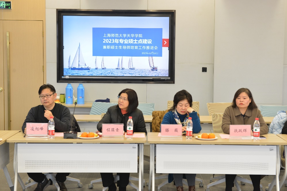 教务处常务副处长徐振介绍了我校第1批21名兼职硕导2023年工作的考核情况,2022年以来,第1批兼职硕导与上师大带教导师联合指导了18位专业硕士生的课题研究,徐子卿等4人独立指导了4名专业硕士的论文撰写工作,每位兼职硕导每月的指导工作量在8-12学时,以线上线下的形式,参与了包括制度学习、招生面试、课题组会、专硕论文评审、开题和论文答辩等在内的专业硕士培养工作。