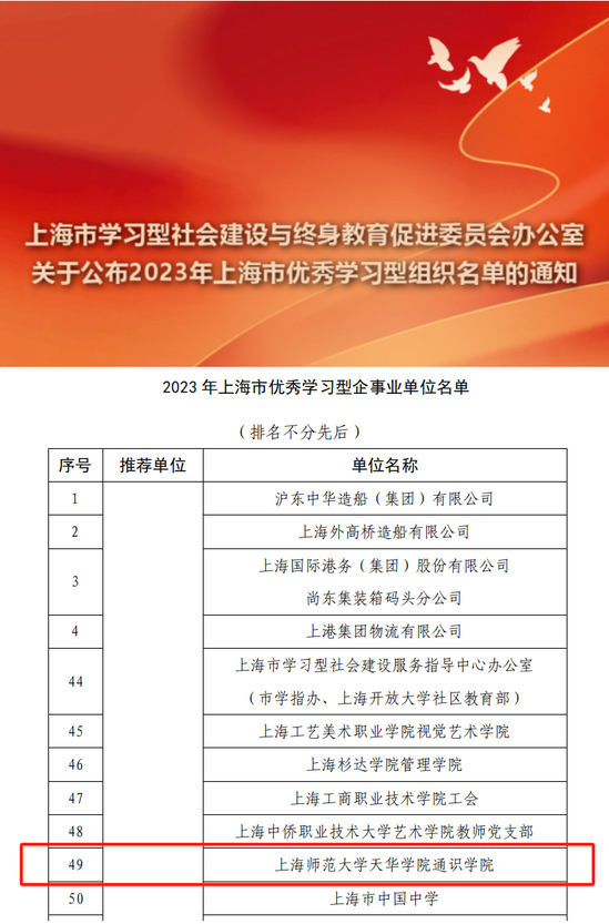 近日,上海市学习型社会建设与终身教育促进委员会办公室公布上海市优秀学习型组织名单,我校通识学院获评“2023年上海市优秀学习型企事业单位”!