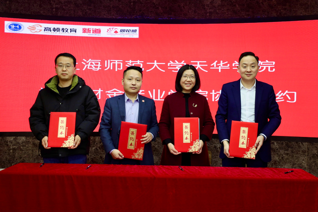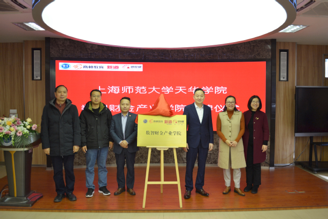 12月22日,上海师范大学天华学院与上海高顿教育科技有限公司、新道科技股份有限公司、杭州同花顺数据开发有限公司共建数智财金产业学院签约暨揭牌仪式在天华学院商学院金融财务创新综合实训室隆重举行。天华学院副校长龚春蕾、副校长朱国权、商学院院长程葆青、高顿教育副总裁舒畅、校企合作总监郭太平、校企合作总监韩勇、产教融合部运营总监张兆春,新道科技上海区总经理林斌、同花顺高校、政府、上市事业部总经理李振科出席仪式。天华学院就业指导中心主任兼校长办公室常务副主任郭伟钧、实习实训处主任符跃鸣、招生办公室常务副主任顾宝君和三家企业的相关负责人也参加了本次活动。