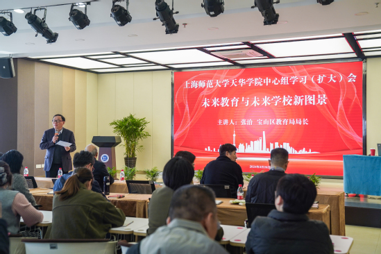 3月26日下午,学校于图书馆四楼报告厅举行中心组(扩大)学习会,特邀宝山区教育局局长张治作《未来教育与未来学校新图景》专题报告。学校党政监领导班子成员、两委委员、基层党总支书记、相关职能部门负责人以及助理级干部、专业主任等参加会议。会议由党委书记高建华主持。