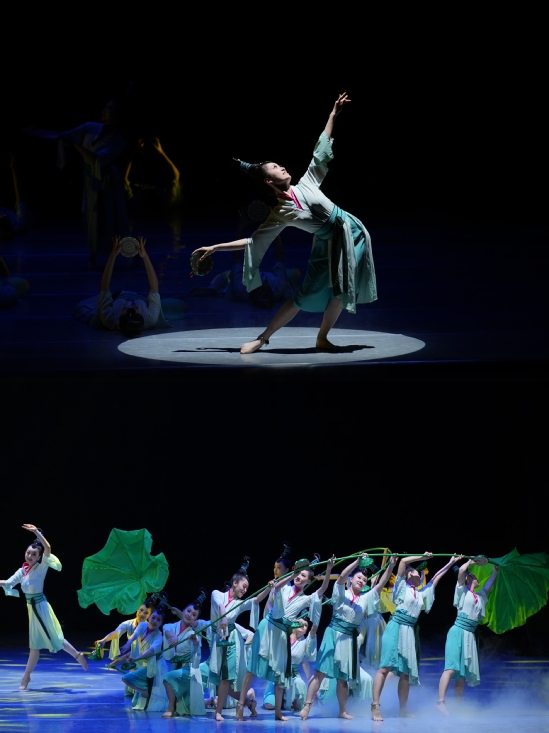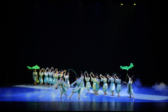 作品《莲鼓越歌行》采用了唐代李颀的诗作《采莲》,诗词描写了一群欢快的越女在越溪嬉戏劳作的生动景象,《莲鼓越歌行》还原了这一场景,演员们在满是荷花的越溪嬉戏采莲,于荷花荷叶间穿梭,尽显劳动人民的朴实快乐和年轻女子的青春灵动,仿佛她们就是一群从莲池而生的荷花精灵,不胜美哉。