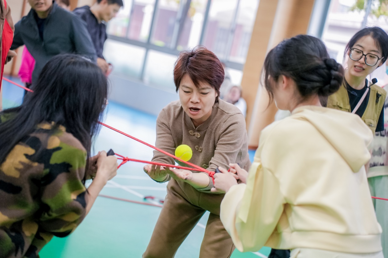 本次运动会项目丰富、内容精彩。在“旱地龙舟”项目比拼中,大家身跨“龙舟”,同心协力,在激昂的口令声中调整步伐,共同向终点线冲刺;“锁定新目标”项目中,教师们聚精会神,手中飞盘在声声喝彩中命中九宫格得分板,为各自的代表队取得精彩成绩;“摸石过河”项目则需要参赛选手使用三块塑胶垫,在手脚不沾地的情况下完成接力,不仅是对体能的考验,也是对身体平衡能力的挑战,教师们纷纷稳踏塑胶板,努力平衡身体,协调四肢、稳中求进;“接力四子棋”则对参赛选手的反应力和速度有着要求,选手需接力跑向一侧放置“布偶棋子”,直至连成四子一线方为成功,在激情昂扬的欢呼与鼓舞下,各代表队也以最佳姿态完成了这一项目的比拼;最后的“纵横天下”项目则一如既往地考验教师们的耐心与专注力,参赛教师全神贯注于手中的两根细绳,不断调试角度与力量,互相配合,将小球以接力运送的形式送入箩筐。