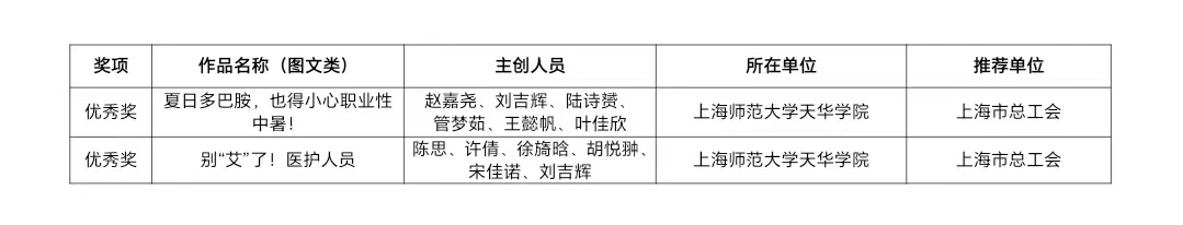 本次活动中,我校健康学院报送的作品《夏日多巴胺,也得小心职业性中暑!》和《别艾了!医护人员》通过了初审、形式审查和专家评审等程序,在全国众多优秀作品中脱颖而出,经上海市总工会推荐荣获国家级图文类作品优秀奖。