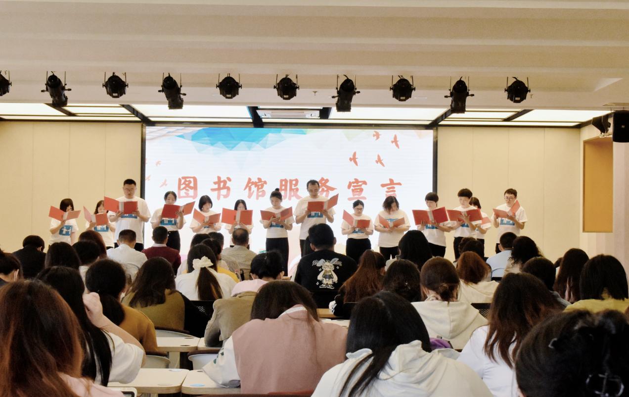 在悠扬的音乐声中,图书馆全体馆员集体诵读庄严的《图书馆服务宣言》,表达了对图书馆工作的无限热爱和敬畏之情,以及更好地为广大师生做好图书馆服务工作的决心。