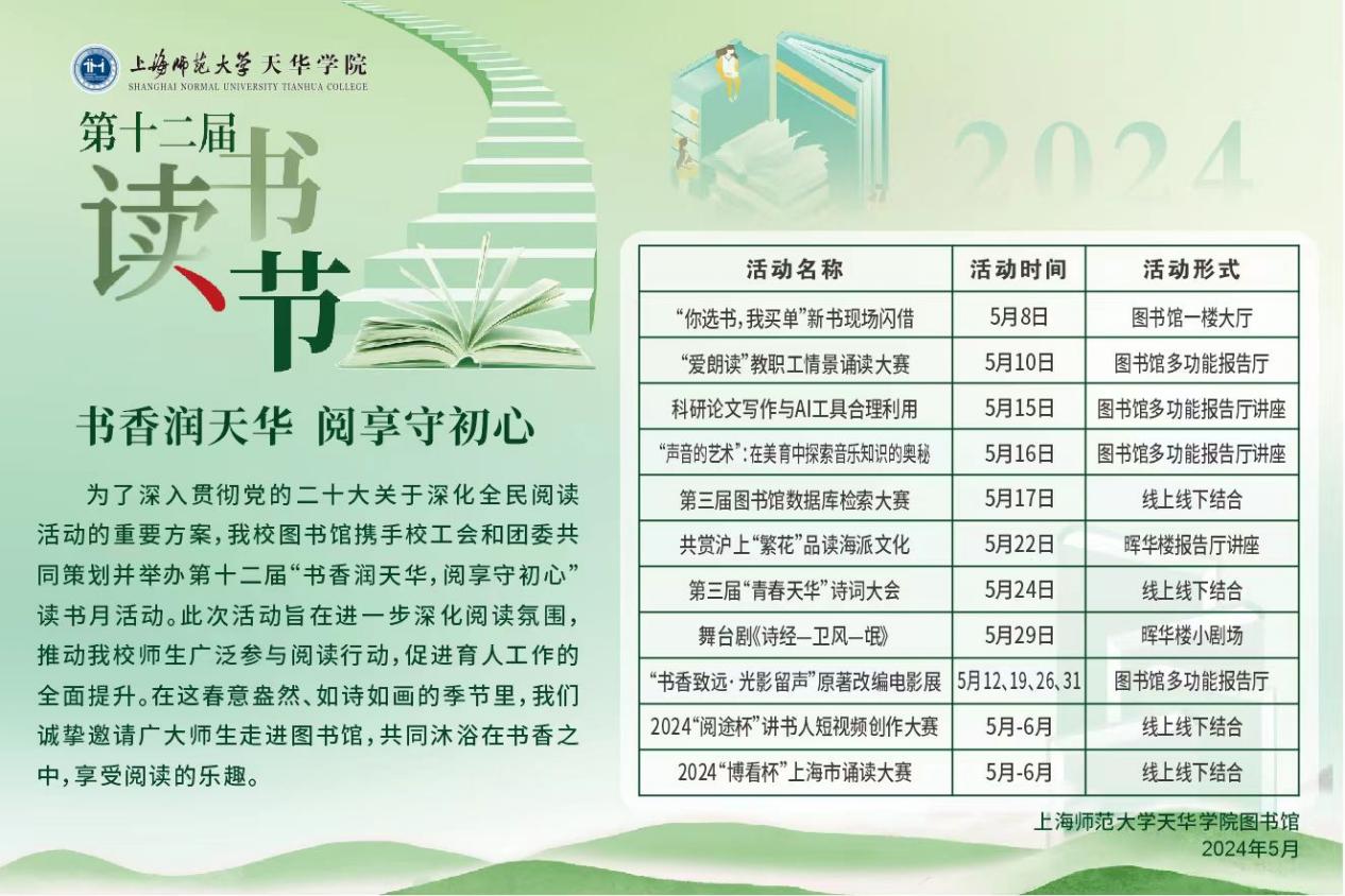 本届读书节将持续一个月时间,期间将举办多场精彩纷呈的活动。我们期待广大师生积极参与其中,共同享受阅读的乐趣,开启一段充满智慧与启迪的旅程。敬请关注图书馆主页以及图书馆微信公众号动态,期待未来的每一天书香润天华,墨香伴成长。