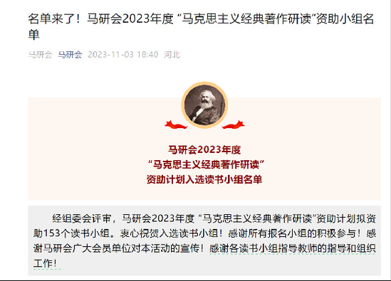 马克思主义学院坚持把马克思与中华优秀传统文化相结合,培育特色鲜明的学院文化,引领校园文化。学院马克思主义与文化研究中心下设“新青年读书会”,组织学生研读马克思主义著作及中华优秀传统文化经典,学习形式自学和集体学习相结合,聘请专家进行阅读指导,定期组织读书分享会、理论学习讲座、学习沙龙、外出考察等活动。2023年,新青年读书会获得北大“马研会”马克思主义经典著作研读资助计划项目。