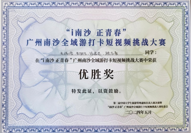 2024年5月19日,在第14个“中国旅游日”当天,由中国旅游协会旅游教育分会、南开大学旅游与服务学院联合中共广州市南沙区共青团委联合举办的第二届中国大学生旅游管理虚拟仿真大赛决赛暨“i南沙 正青春”广州南沙全域游打卡短视频挑战大赛决赛在广州南沙举行闭幕式暨颁奖典礼。