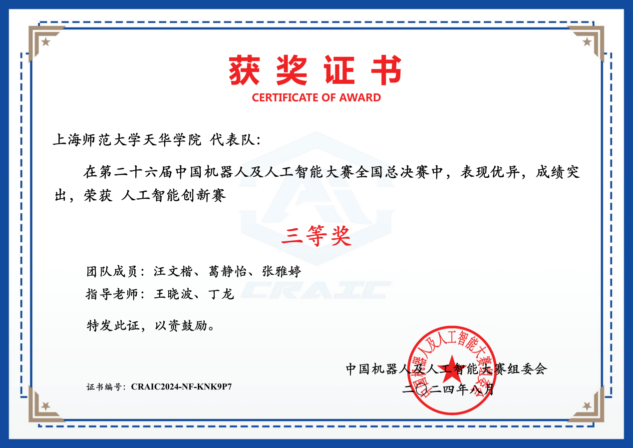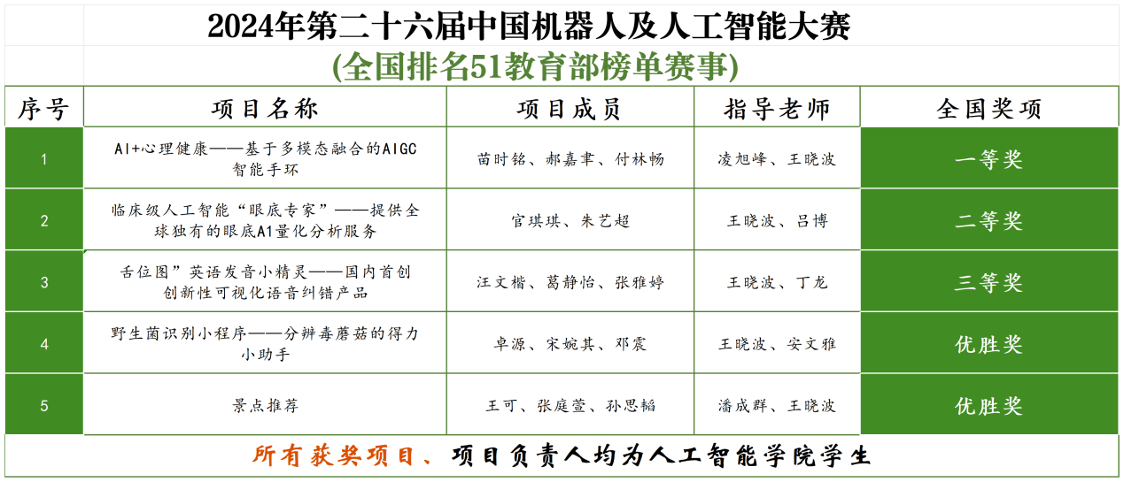 全国一等奖项目为“AI+心理健康--多模态融合的AIGC手环”,由苗时铭、郝嘉聿、付林畅同学完成,指导老师为凌旭峰和王晓波。全国二等奖项目“临床级‘人工智能眼底专家’--提供全球独有的AI量化分析服务”由官琪琪和朱艺超同学完成,指导老师为王晓波和吕博。全国三等奖项目“舌位图英语发音小精灵”由汪文楷、葛静怡、张雅婷同学完成,指导老师为王晓波和丁龙。