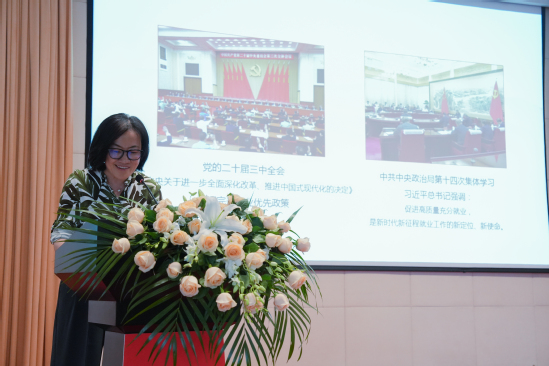 首先,许岳代表就业指导中心进行了2024届毕业生就业数据的分析和发布。报告主要从24届毕业生的就业成绩、目前的就业形势、学校的应对举措以及对新一届毕业生就业工作的思考与展望四个方面展开,解读了学校就业率与各二级学院的就业去向落实率。许岳表示,面对严峻的就业形势,学校打出一套有力的就业“组合牌”来应对毕业生就业工作的顺利进行。从统筹全局、拓宽渠道、完善服务、协同育人、严把数据、多管并举六个方面入手,实现就业高质量、多元化,考研留学佳绩频传的工作效果。面对新一届毕业生的就业工作,许岳提出了下一步工作的要求与展望。希望全体就业工作者群策群力,为学生们开辟新天地,出色完成2025届毕业生的就业工作。