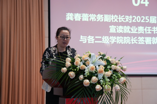 接着,常务副校长龚春蕾对2025届就业工作提出要求。她表示要关注到专业方向与岗位需求的适配度,提高学生在岗位中的竞争力,发掘校友资源、校企合作的就业机会。并与各二级学院院长签署就业工作责任书,全力为2025届毕业生们的就业工作保驾护航。