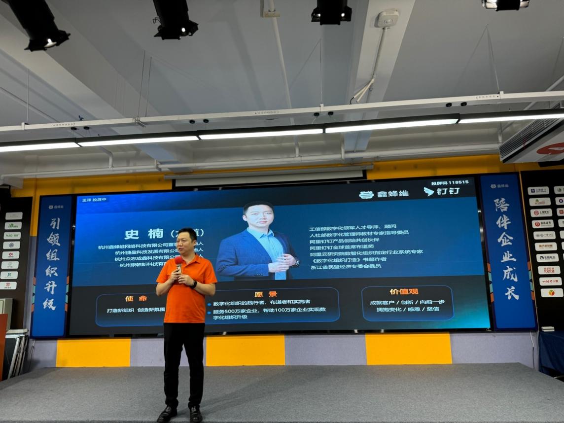 第二站,学员们来到了鑫蜂维网络科技有限公司。这是全国最大的企业数字化转型服务公司,也是阿里巴巴合资公司、钉钉全球首家共创公司,是杭州的准独角兽企业。公司总裁从“把工作与生活分开”的理念出发,为大家详细介绍了公司积极探索数字经济“算法和机制”的核心价值,以及开创数字化服务企业的发展历程。学员们认真了解了该公司的数字化服务能力和成功案例,对数字化创新多了更深层次的体会和感悟。