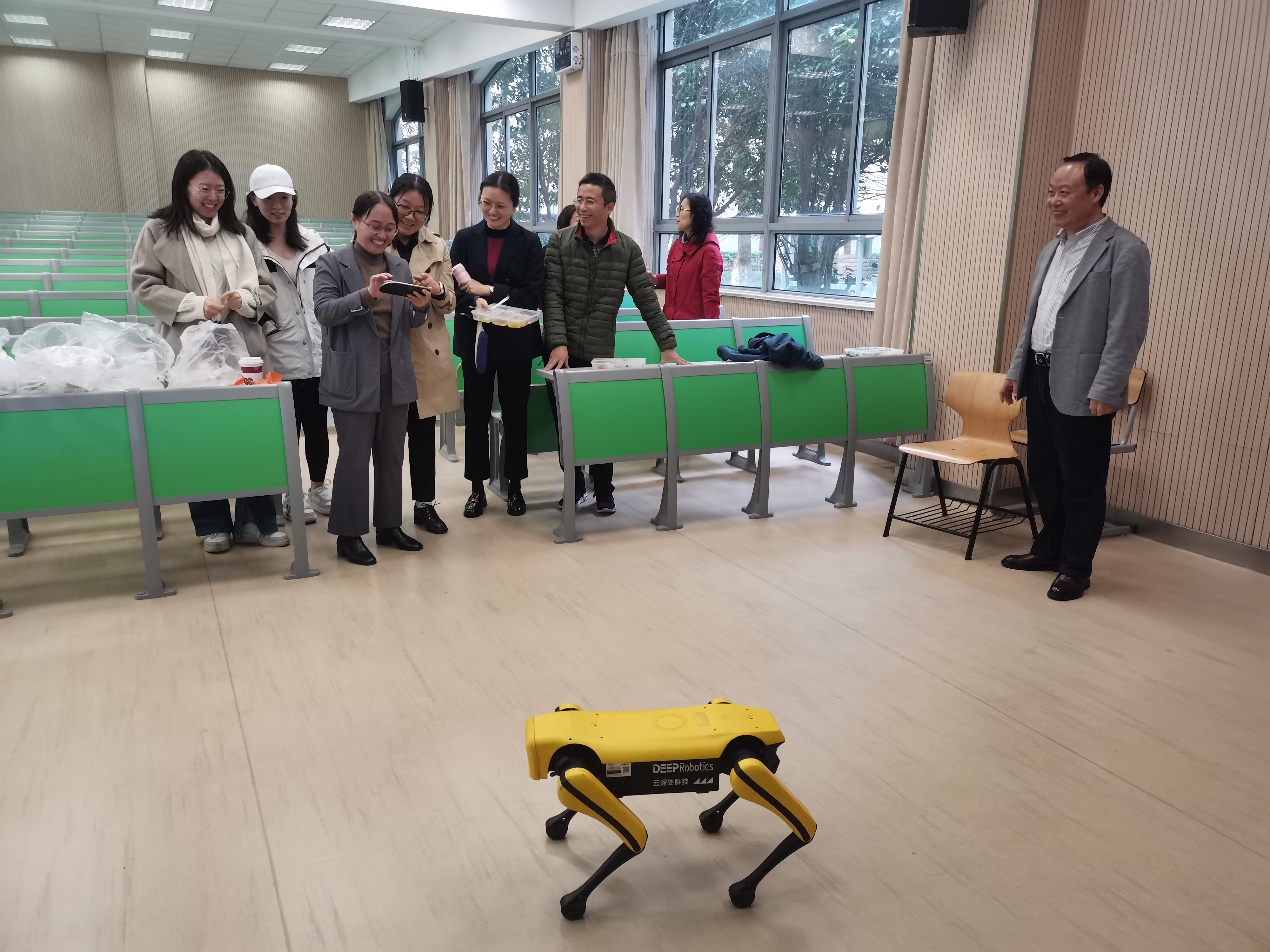 最后,朱怀中老师向大家演示了杭州云深处公司研发的四足巡游机器人绝影lite2,大家也兴致勃勃的亲自动手操作,巡游机器人动作灵敏,可以跳动、翻滚等,引得大家不禁开怀大笑。大家深刻感悟到,随着人工智能技术的日益成熟和普及,全面进入智能化时代已经成为了必然的趋势。未来人类的生产、生活、学习、交往等方方面面都将受到人工智能技术的影响和改变,因此必须具备对人工智能的基本认识和理解,提高与之相适应的能力和素质。