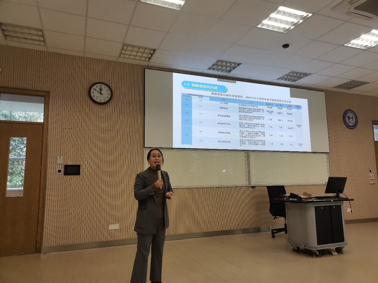 石玲老师在做分享之前,与大家做了积极的互动,先耐心解答了大家有关汽车的一些问题。接下来,石玲老师主要与大家从三方面做分享:一.智能网联汽车概述。智能网联汽车是在普通汽车的基础上增加了传感器、控制器、执行器等装置,实现与人、车、路等的智能信息交换,并使车辆按照人的意愿到达目的地。智能网联汽车会“思考”、“判断”、“行走”,可以自动启动、加速、刹车,可以自动绕过地面障碍物。二.智能网联汽车关键技术。包括环境感知技术、无线通信技术、车载网络技术、导航定位技术、先进驾驶辅助技术、安全技术、运动控制技术、路径规划技术等。三.智能网联汽车发展趋势。智能网联汽车朝向:智能化、网联化、电动化、共享化方面发展。