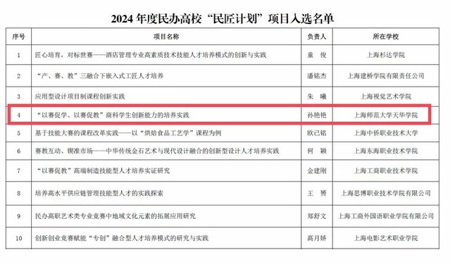 民匠计划是上海市教育委员会与上海市民办教育发展基金会联合推出的教育项目,于2024年荣耀启航,首次实施即展现其深远影响。根据《上海市教育委员会 上海市民办教育发展基金会关于印发<上海市民办高校“民匠计划”项目管理办法>的通知》(沪教委民〔2024〕23号)和《上海市教育委员会 上海市民办教育发展基金会关于开展2024年度“民匠计划”项目申报工作的通知》(沪教委民〔2024〕30号),学校组织了遴选、推荐和指导。根据上海市教育委员会公布2024年度上海市民办高校“民匠计划”项目入选人员名单(沪教委民【2024】37号)立项文件通知,我校商学院的孙艳艳老师成功入选。