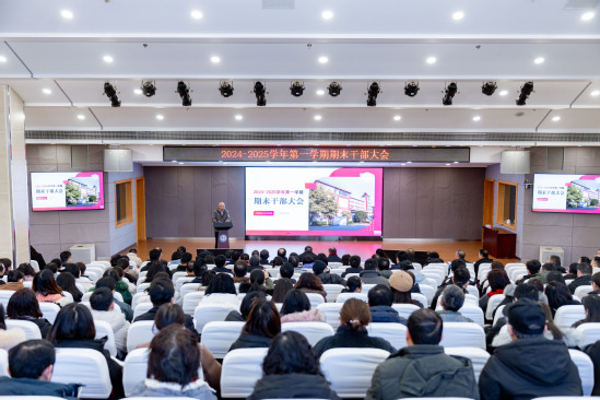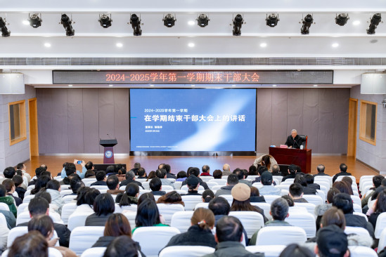 常务副校长龚春蕾盘点了本学期学校在招生就业、各类评价排名、教师教学科研、双优行动计划、国际合作交流、学生成长成才、资产财务后勤、培训服务品牌等方面取得的可喜成绩。针对当前面临的危机和险阻,龚春蕾提出了要加紧与学校可持续发展相关的评估转设进程、加宽与学科专业转型相关的产教融合路径、加大与课程教学改革相关的AI赋能力度、加密与学生身心发展相关的全员育人网络、加强与当家理财相关的教学管理成本核算的破解良策。新的团队、新的目标,希望大家一起敢想敢拼、说到做到、坚韧不拔、坚持到底,进一步加厚办学积累,擘画未来的发展蓝图。