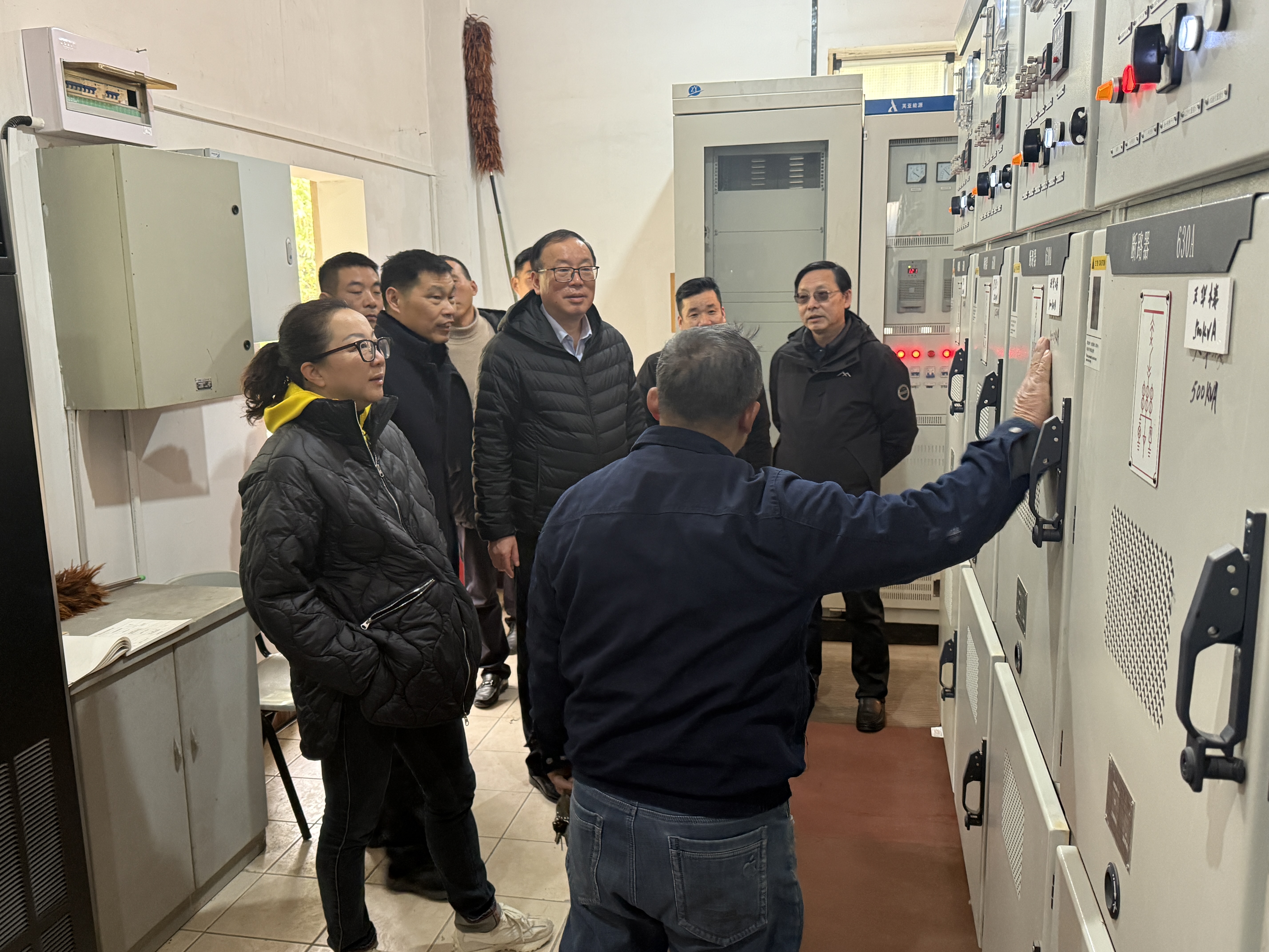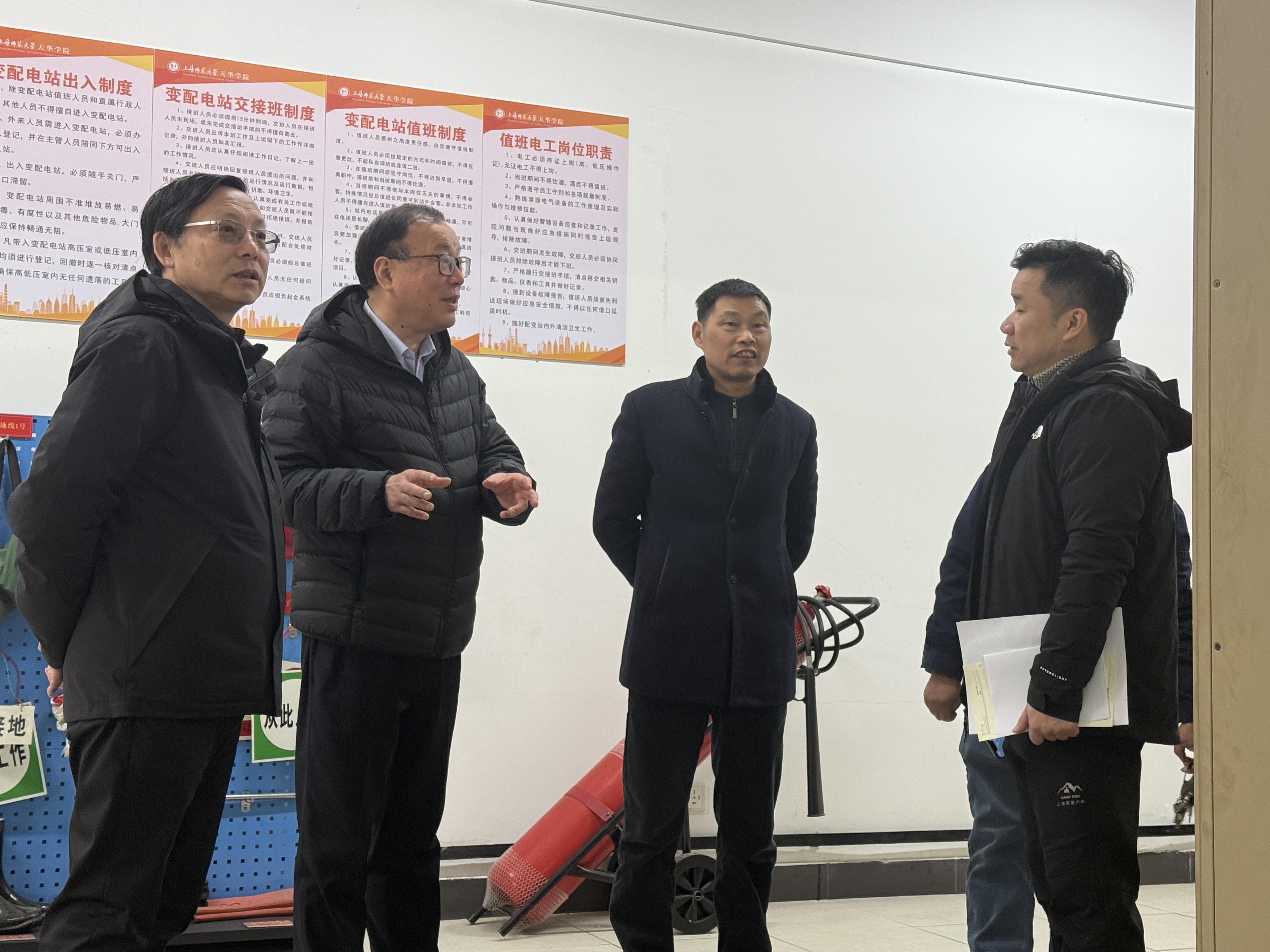 “水电”保障是校园日常运作的基石。在学保处处长刘洪伟的引导下,检查组首先来到了位于明华楼的配电站。高书记仔细询问了电力设备的日常维护情况,并对配电站的防火、防水、防触电措施进行了重点检查。他强调电力保障关乎校园的方方面面,任何一个小的疏忽都可能引发严重后果,假期值班人员务必加强巡查,确保电力供应万无一失。