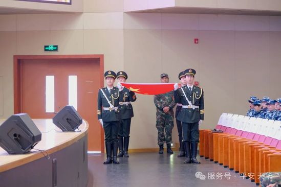 此刻,是青春力量的凝结,是青春声音的迸发。在庄严肃穆的氛围中,大会在迎国旗、奏唱国歌的仪式中正式拉开了序幕,国歌的旋律在大礼堂上空回荡,点燃了每一位在场者的希望、信仰以及对军训的向往。
