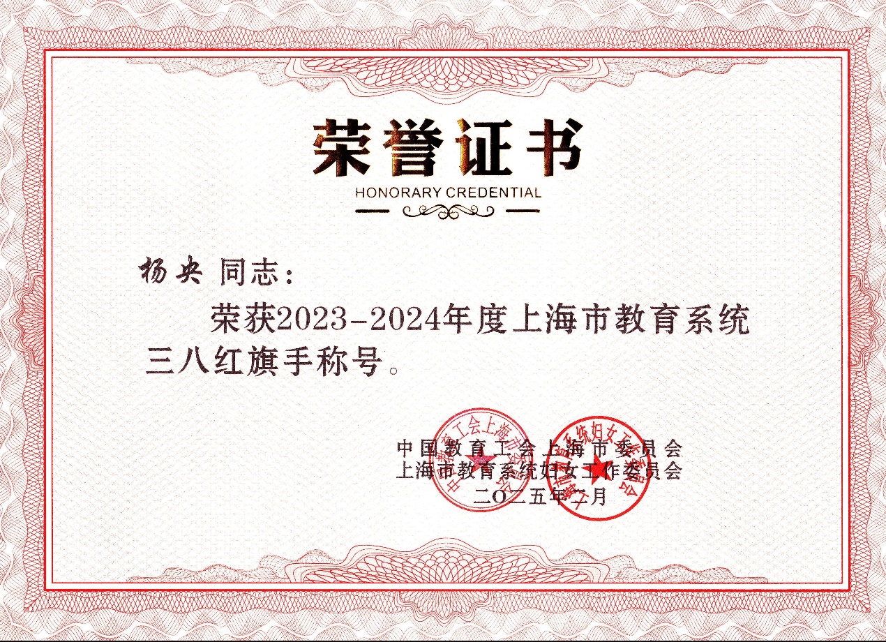 我校工会常务副主席曹卫携获奖教师代表参会。在此次表彰中,学生与保卫工作处副处长杨央,凭借在学生管理工作的突出贡献,荣获 “上海市教育系统三八红旗手”称号。