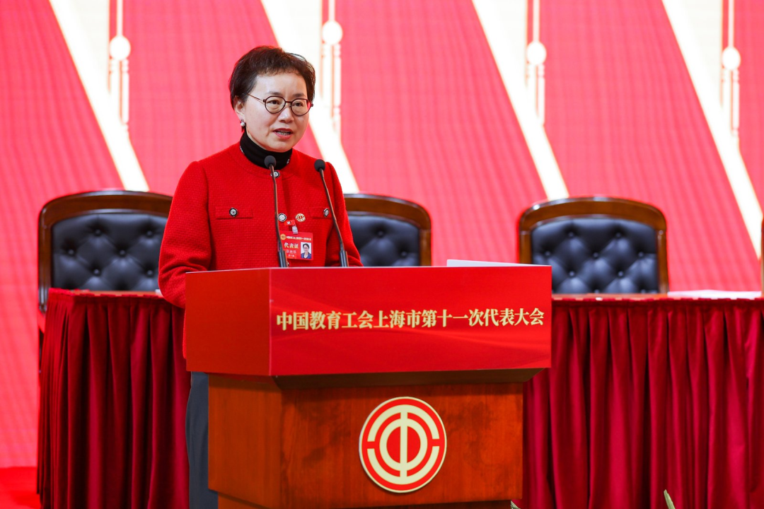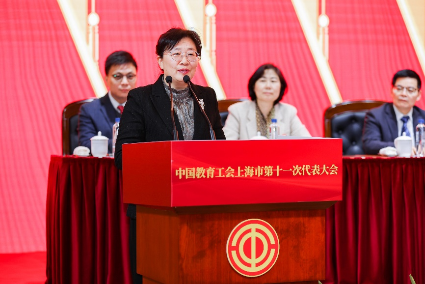 中国教科文卫体工会主席高洁发表讲话,她代表中国教科文卫体工会全国委员会向大会的召开表示热烈祝贺,向出席会议的代表和辛勤工作在上海市教育一线的广大教育工作者致以亲切问候和崇高敬意,向关心支持教育工会工作的各级党政领导和各界人士表示衷心感谢。她指出,中国教育工会上海市委员会是全国唯一的由毛泽东同志亲笔题写会名的产业工会,在新时代教育事业取得历史性成就的伟大进程中做了大量开创性工作,在上海率先总体实现教育现代化进程中发挥了主力军的作用,为全国教育系统工会工作树立了榜样。她强调,全市各级教育工会要认真贯彻落实党中央重大决策部署,团结引领全市教职工,为推动上海教育高质量发展和教育强国建设而拼搏奋斗。一是牢牢把握工会工作正确政治方向;二是切实加强教职工的思想政治引领;三是充分激发广大教职工投身建设教育强国的创新创造活力;四是用心用情履行维权服务的基本职责。
