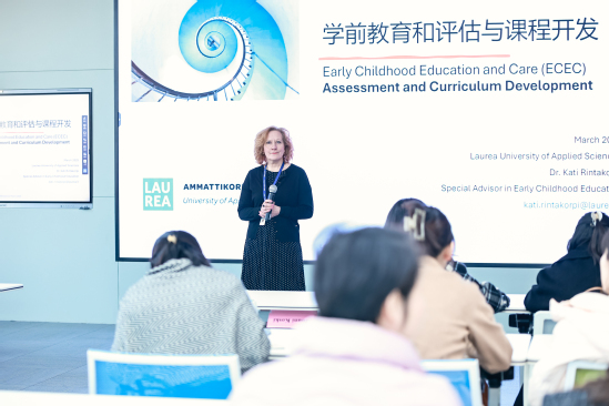 当天下午,罗约阿应用科学大学幼儿教育特别顾问Kati Rintakorpi博士为天华学院师生带来了一场题为《学前教育的评估和课程开发》的专题讲座。Kati博士结合芬兰学前教育的实践经验,分享了如何通过科学的评估和课程设计提升学前教育质量。她指出,评估不仅仅是衡量学习成果的工具,更是支持学习和发展的过程。Kati博士引用了爱因斯坦的名言:“并非所有可以计算的东西都有意义,也并非所有有意义的东西都可以计算”,强调了评估应关注儿童的全面发展,而不仅仅是量化指标。