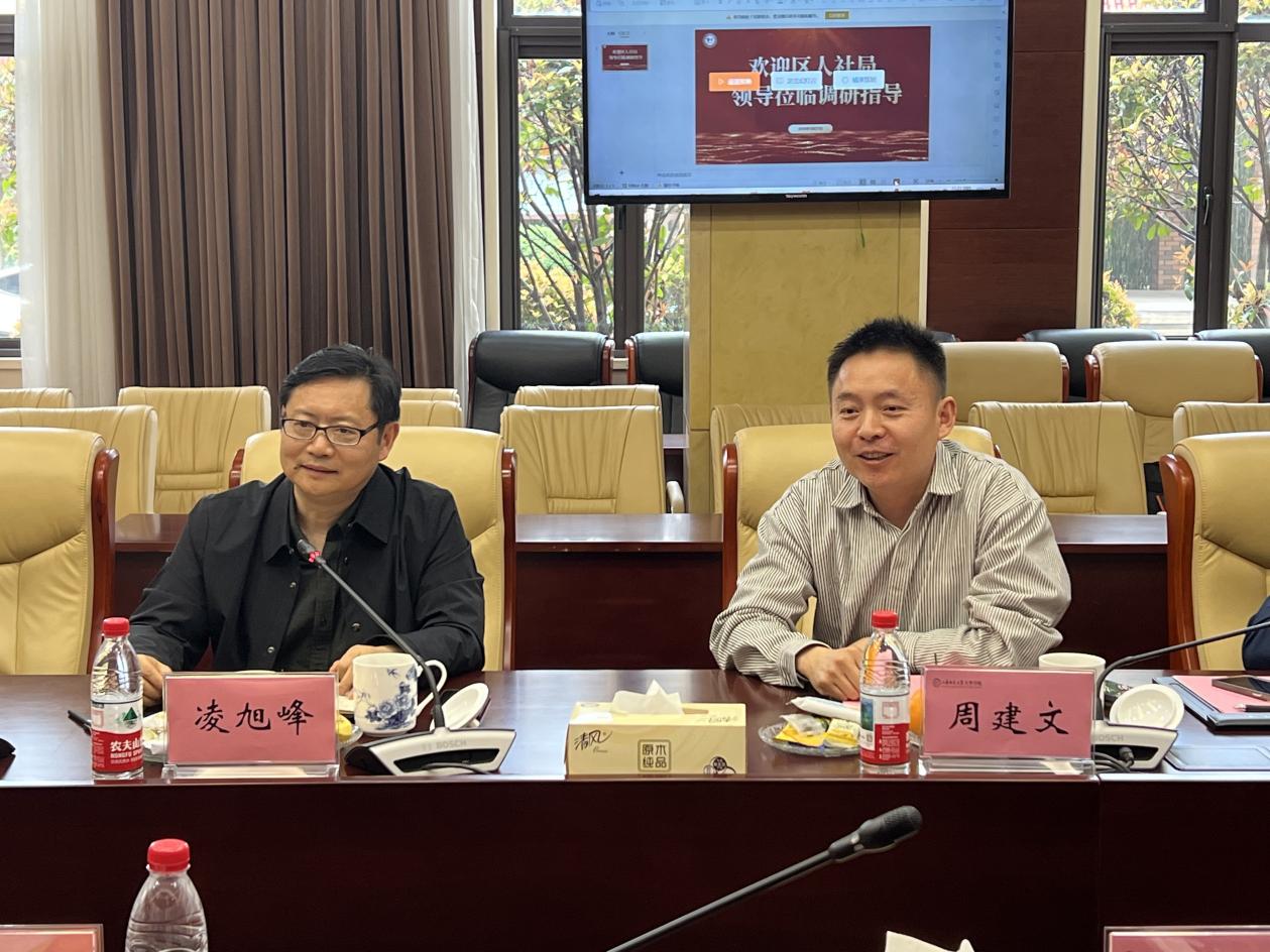 调研座谈会上,凌旭峰副校长主持会议并致欢迎辞。人工智能学院党总支书记赵科介绍了学校基本概况。人工智能学院副院长李忠唐汇报了学校技能培训工作进展。对外合作培训学院常务副院长周建文进行了交流发言。凌旭峰副校长进一步提出,学校正在规划成立人工智能研究院和人工智能产业学院,未来将着力推动学生能力提升、人工智能产业升级和区域人工智能产业集群发展,希望区人社局在实训基地建设、技能培训考点资质及社会化评价机构资质申请等方面给予指导支持。