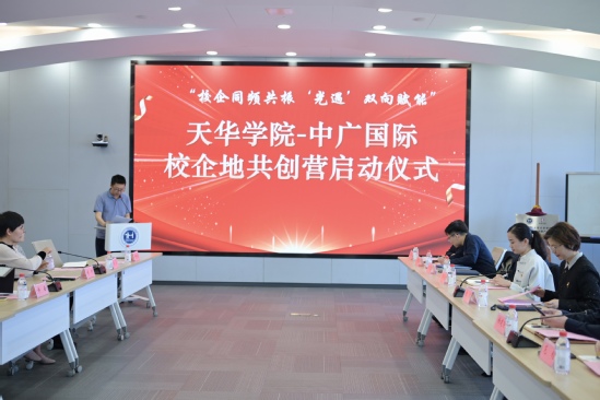 天华学院校级助理、就业与生涯指导中心主任胡珍详细介绍了学院校企合作模式,涵盖课程共建、产业学院设立、联合科研、教材开发等多个领域。她还就学校专业调整方向及新校区智能机器人产学研融合创新中心的规划作了说明,希望以此为契机,进一步服务区域经济社会发展。中广国际党总支书记、总经理戴鸣刚阐述了企业在合作中的具体规划。他表示,作为国家级广告产业园区,中广国际将积极搭建校企交流平台,提供就业创业一体化服务,推动教育与文化产业深度结合。通过整合园区企业资源,为学生提供实习实践机会,开展招聘、创业扶持活动,同时以三方党建共建促进产业链、创新链与教育链有机衔接。