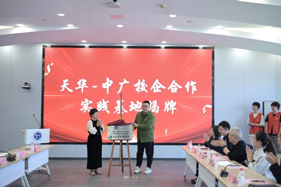 胡珍、戴鸣刚共同为天华—中广校企合作实践基地揭牌。双方将依托这一产教融合的创新载体,推动教育与产业协同发展。“我们与天华学院携手打造的校企合作实践基地,正是我们探索产教深度融合的创新载体。”中广国际党总支副书记许雯表示,实践基地搭建了互通平台,不仅为学生提供实习机会,还引入企业真实项目,帮助学生做到学以致用。