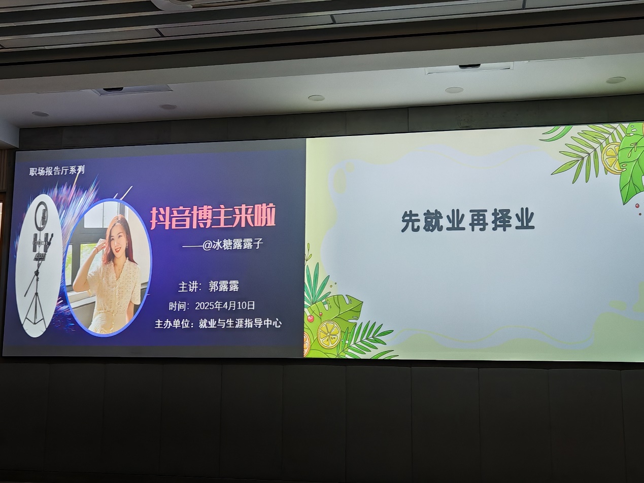 2025 年 4 月 10 日,我校就业与生涯指导中心成功举办了本学期第三期职场报告厅活动。本次活动邀请到抖音人气博主@冰糖露露子,这位拥有72万粉丝、获赞超2000万的博主,用自己独特的职业成长故事,为在场同学打开了一扇看待就业的新窗口。