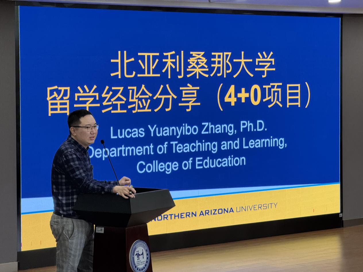 为帮助学生深入了解4+0中外合作办学机构的合作学校美国北亚利桑那大学(Northern Arizona University,简称NAU),国际交流处于 2025 年 4 月 11 日邀请北亚利桑那大学教育学院教授 Lucas Yuanyibo Zhang 博士进行留学分享。出席本次分享会的嘉宾有:国际交流处处长、北亚利桑那学院常务副院长胡雅楠、国际交流处副处长夏智源、学前教育(中外合作办学)专业主任井韵绮、小学教育(中外合作办学)专业主任柴豪頔、国际交流处教师陈笑及辅导员们。同时,正在美国 NAU 就读的 2022 级小学教育(中外合作办学)专业学生叶子莎和杜鑫颜也作为嘉宾,通过视频分享了自己的留学经历。