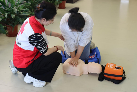 在理论讲解中,陈老师详细阐释了心肺复苏的完整流程,从判断现场环境安全、检查患者意识和呼吸,到胸外按压的精准位置、深度(5-6厘米)与频率(每分钟100-120次),再到人工呼吸的规范操作和注意事项,每一个细节都讲解得清晰明了。同时,还对自动体外除颤器(AED)的工作原理、使用方法及在急救中的关键作用进行了细致解读,让辅导员们全面了解这一重要急救设备。