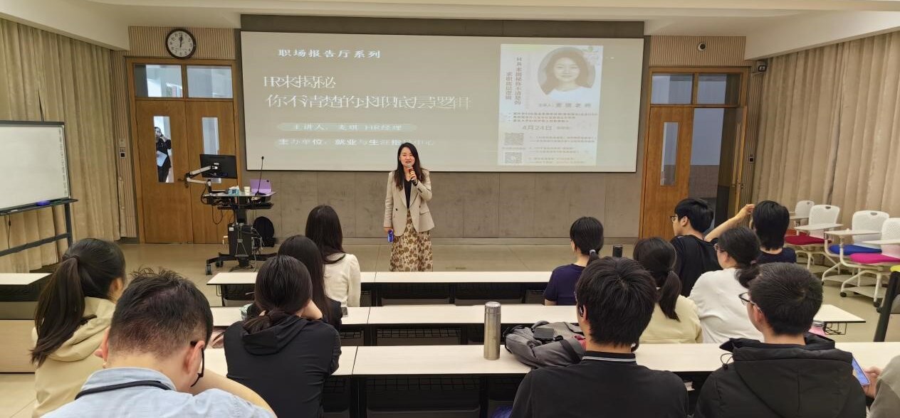 我校就业与生涯指导中心于2025年4月24日在日阶103教室成功举办了本学期第五期职场报告厅活动。本次活动荣幸邀请到了世界500强的外企人力资源总监麦琪老师,给同学们分享了AI时代大学生职业规划与求职攻略。