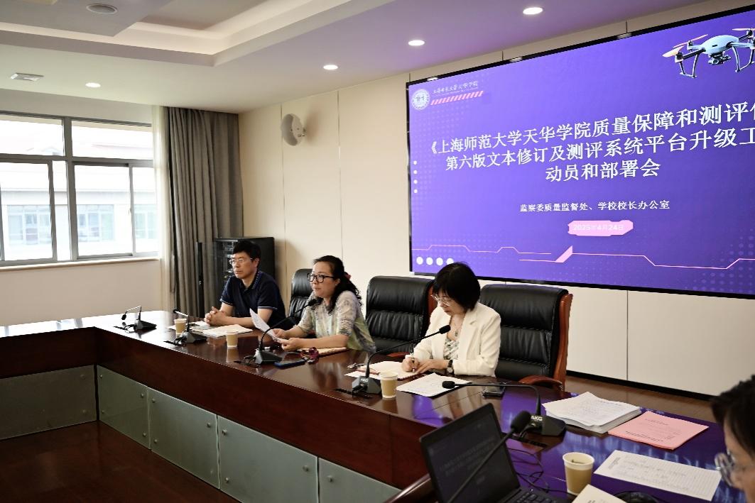 2025 年 4 月 24 日中午,监察委质量监督处和校长办公室在明华楼会议中心召开《上海师范大学天华学院质量保障和测评体系》第六版文本修订及测评系统升级工作动员和部署会。学校常务副校长龚春蕾、监察委副总校监吴国兴出席会议,监察委质量监督处处长陈再阳、督学董海霞及相关处室和二级学院的负责人、分管领导、骨干等参会。