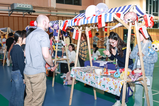 活动现场热闹非凡,通过展示学校国际化发展历程、留学项目成果以及英语第二课堂活动集锦,吸引了众多师生驻足观看。常驻外教们还精心准备了各种有趣的互动活动,如“你画我猜”“教我一句家乡话” 等,同学们积极参与其中,与外教们亲密互动,现场气氛热烈。