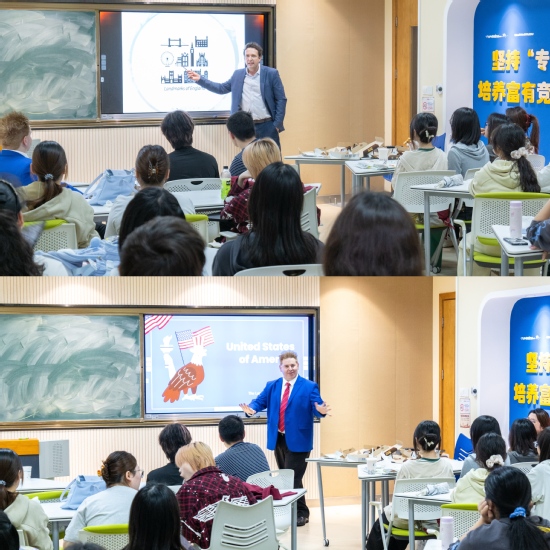 4 月 22 日中午,跨文化交流沙龙在日阶105举行,由国际交流处赵诗佳老师主持。本次沙龙邀请了两位明星外教 Paul Philpott 和 Dr.Scott Kyle Stockton,分别分享了美国和英国的文化特色、校园生活以及历史人文。通过生动的讲解和丰富的图片展示,同学们仿佛身临其境,感受到了不同文化的魅力,进一步激发了大家对跨文化交流的兴趣和热情。