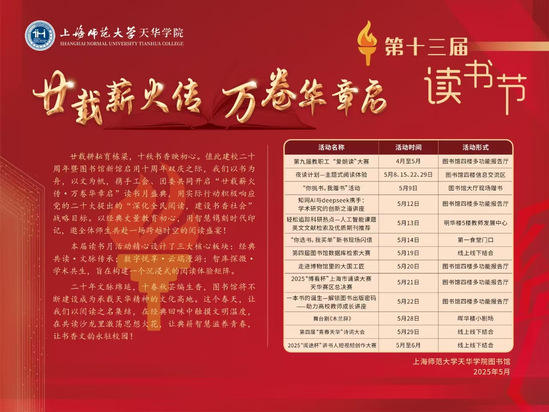 本届读书节将历时一个月,期间将陆续推出系列精彩活动。图书馆诚挚邀请全校师生踊跃参与,在书香氤氲中共同开启一段启迪智慧、润泽心灵的阅读之旅。更多活动详情敬请持续关注图书馆官方网站及微信公众号,让我们携手并肩,以书为友,让馥郁书香渗透至天华校园的每一寸土地,于笔墨的芬芳里共同见证彼此的茁壮成长与华丽蜕变。