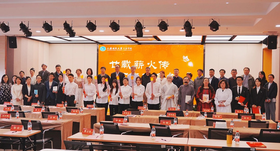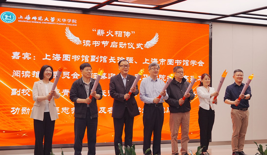 上海图书馆副馆长徐强、上海市图书馆学会阅读推广委员会主任蔡迎春、天华学院党委书记高建华、副校长程葆青和徐子卿、首任馆长吴国兴、功勋馆长吴志荣手握火炬,在5秒的倒计时后,七支火炬同时点燃了象征文化传承的阅读圣火,璀璨的火光宣告天华学院图书馆第十三届读书节正式拉开帷幕。在庄重而神圣的“薪火相传”仪式中,领导嘉宾们将熊熊燃烧的火炬郑重地传递到学生代表手中。跳动的火焰不仅传递着知识的火种,更象征着天华人对阅读精神的代代相承。仪式结束后,领导嘉宾与全体与会人员在火炬台前合影留念,将这意义非凡的时刻永远定格。