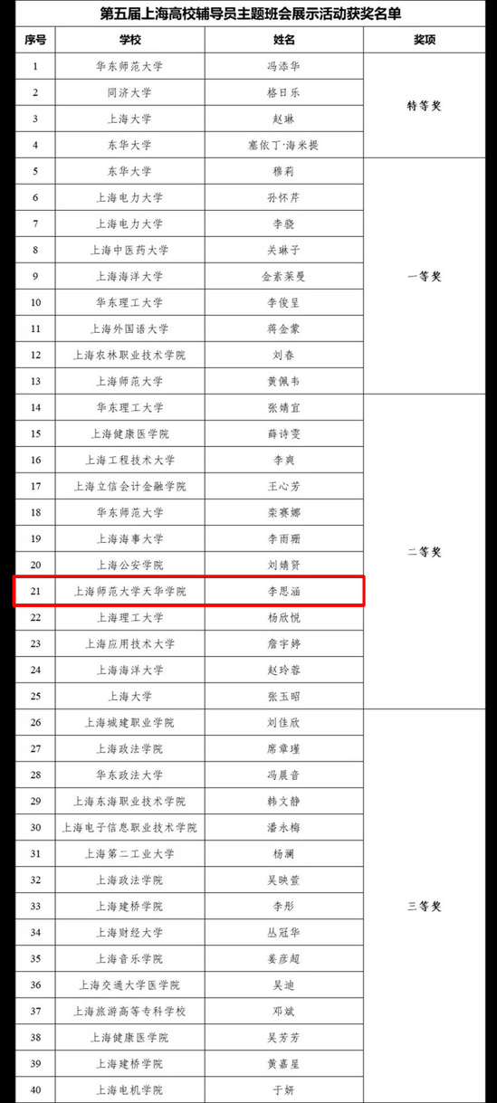 经教案评审、说课展示、现场教学等环节,我校教育学院专职辅导员李思涵老师荣获第五届上海高校辅导员主题班会展示活动二等奖!