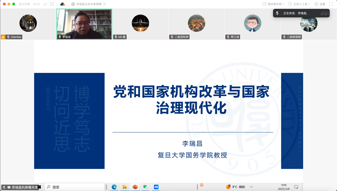3月8日,复旦大学李瑞昌教授以《党和国家机构改革与国家治理现代化》为题,梳理关键机构改革脉络,结合上海“一网通办”改革实践,阐释“职能优化、协同高效”的政府治理体系构建路径,强调党对机构编制的集中统一领导在提升治理效能中的核心作用。