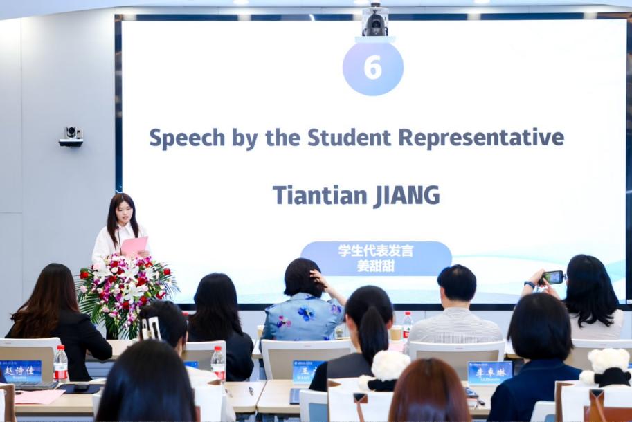 环境设计专业姜甜甜同学作为学生代表发言。她表示,非常荣幸获得新加坡科技设计大学的录取机会。在人工智能与多学科融合发展的时代背景下,这一跨专业深造平台将为个人职业发展带来显著优势。于此同时,她还表达了坚定的求学决心。