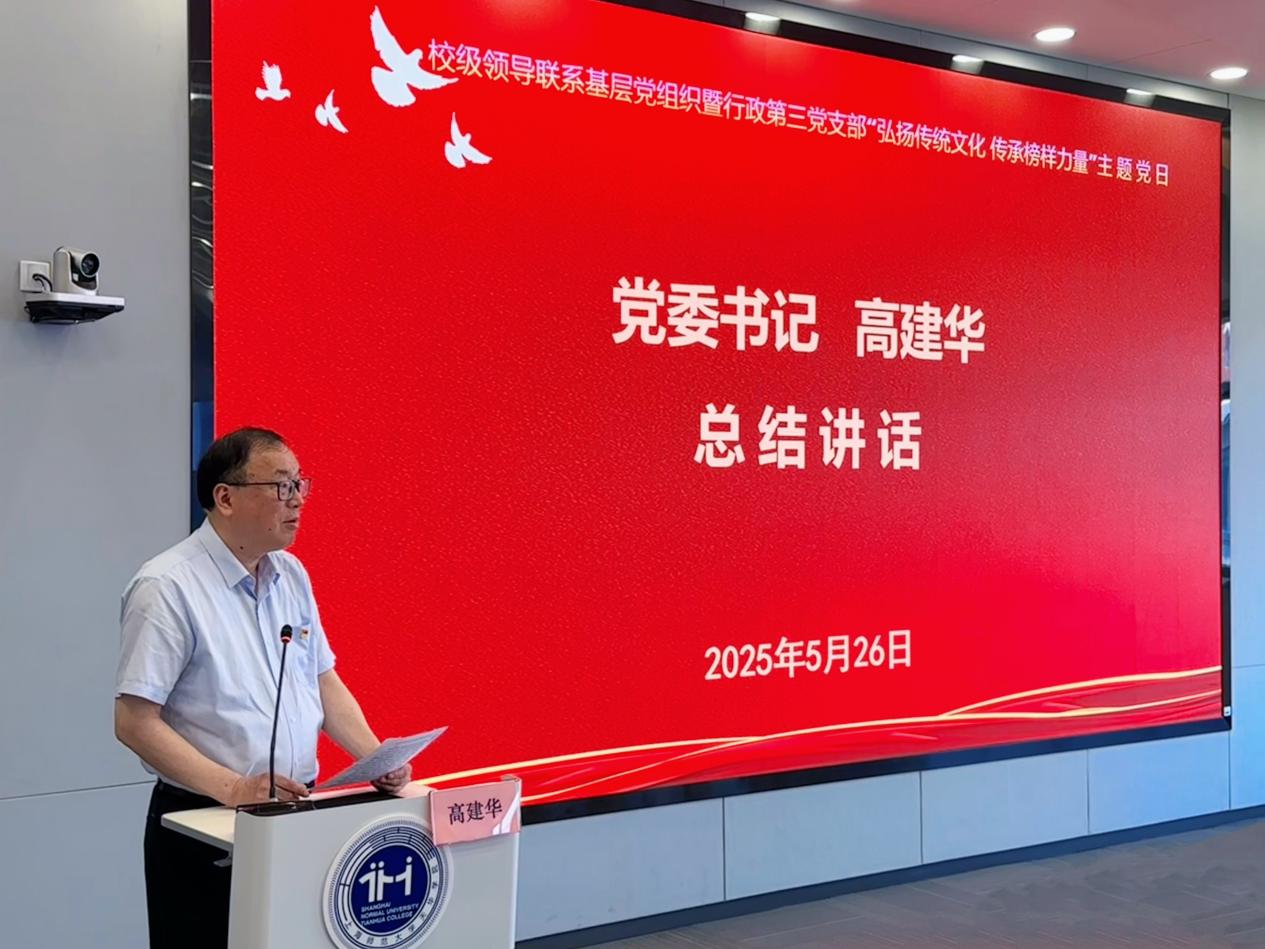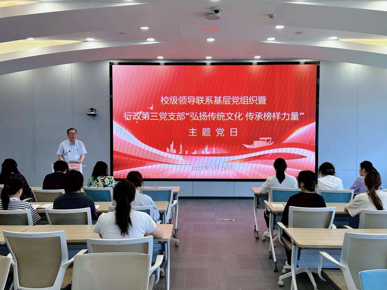 为深入贯彻落实《中国共产党支部工作条例(试行)》,切实加强对基层党组织的领导,全面提升新时代基层党组织建设质量。5月26日,校党委书记高建华在明华楼教师远程中心参加校级领导联系基层党组织暨行政第三党支部“弘扬传统文化 传承榜样力量”主题党日活动。行政党总支委员、行政第三党支部全体党员参加。
