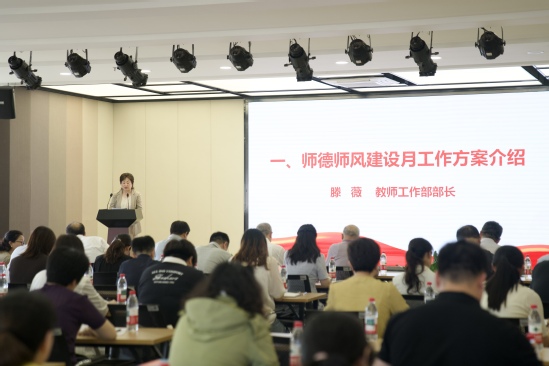 校级助理、人事处处长、教师工作部部长滕薇介绍学校师德师风建设月工作方案,指出本次活动以“弘扬教育家精神,铸就新时代师魂”为宗旨,包括组织主题讲座、签署师德承诺书、开展师德考核、组织师德讲坛、评选最喜欢的老师、聘请师德师风监督员和制作教育家精神校历等七项内容,着眼于长效机制的构建,体现了学校狠抓师德师风建设的坚定决心和清晰路径。