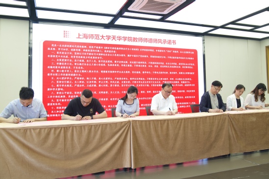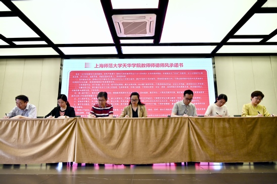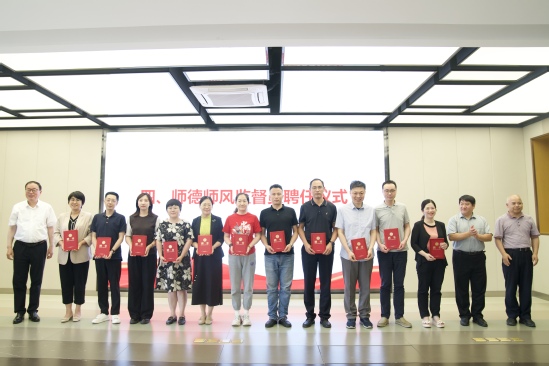 会上,高建华、龚春蕾与各院(处)级单位干部代表签署师德承诺书,表示将以身作则,带头践行高尚师德,引领全校教师共同守护好我们的精神家园。江鸿波、高建华、叶才福为首期聘任的师德师风监督员颁发聘书,希望他们认真履行职责,敢于监督、善于监督,当好师德师风的“观察哨”和“守护者”,成为学校与师生、社会沟通的桥梁。