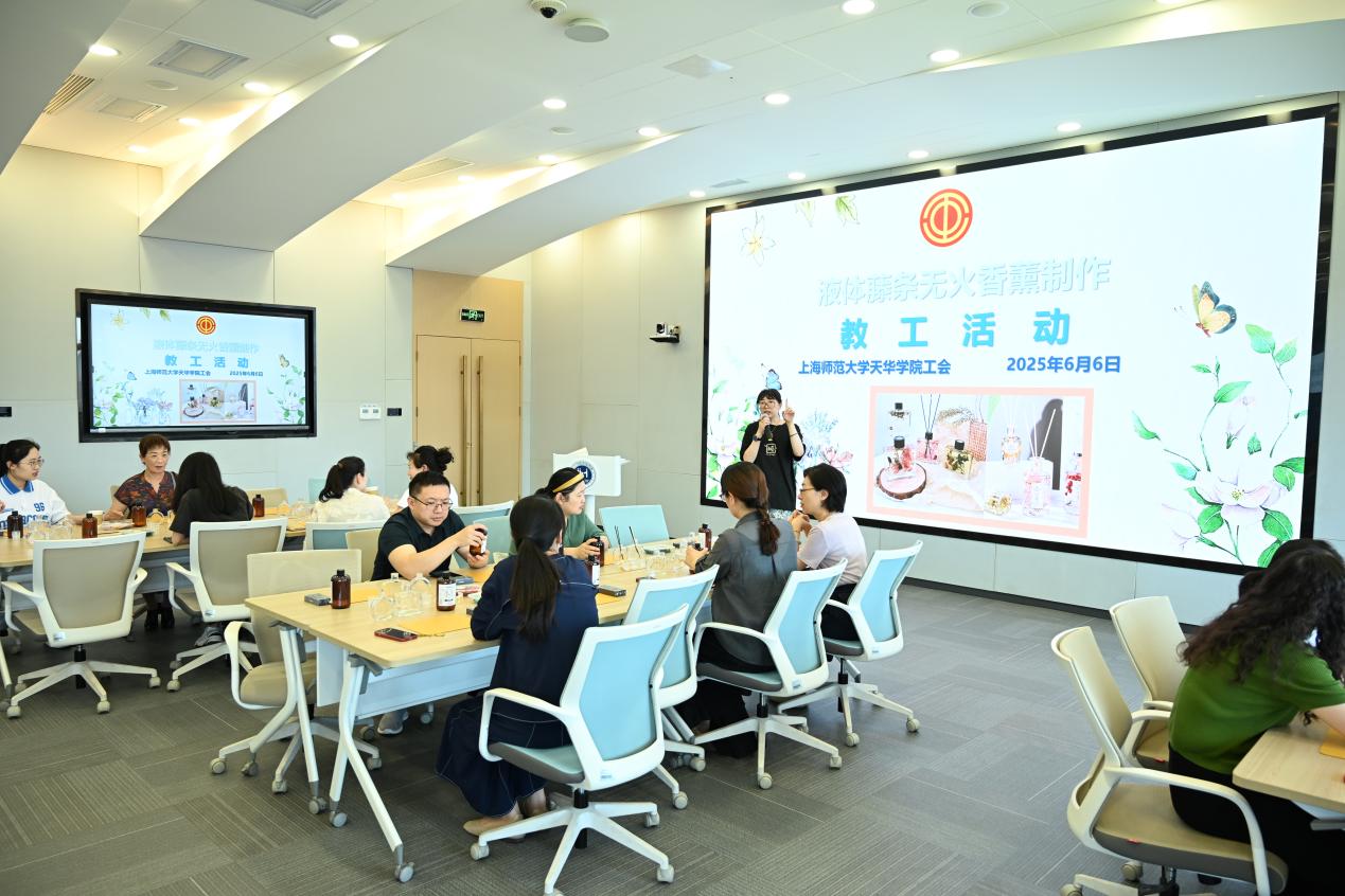 6月6日下午,校工会在明华楼远程教学中心举办了一场温馨雅致的无火香薰制作活动。数十位教职工以天然精油为墨、以藤条为笔,共同绘制芬芳画卷,感受指尖艺术与嗅觉美学的交融,在氤氲香气中开启了一场治愈身心的艺术之旅。