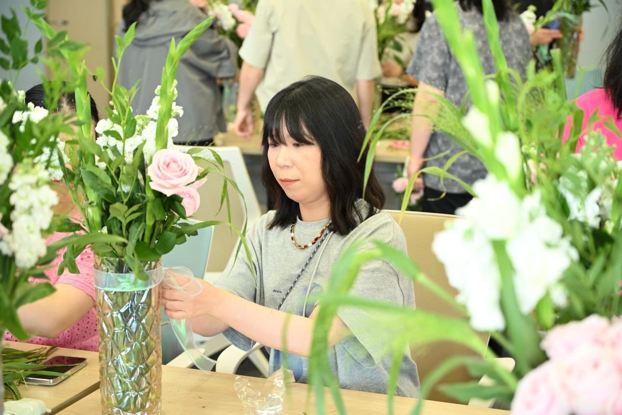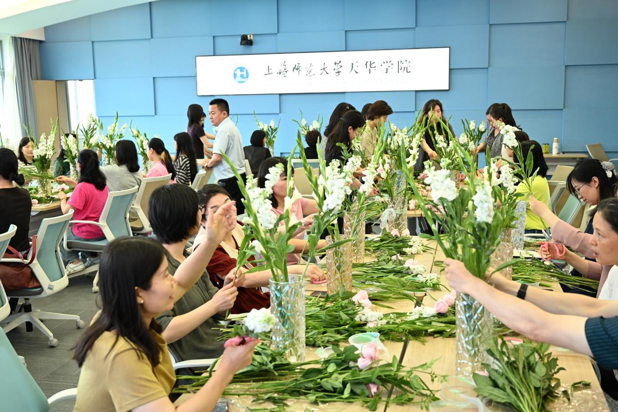 活动现场,花艺师首先从花材选择、色彩搭配到造型设计进行了系统讲解,并现场演示了花枝修剪和插花技巧。老师们在专家的指导下专注地修剪花枝、构思造型,在馥郁芬芳中交流心得,享受着难得的艺术时光。