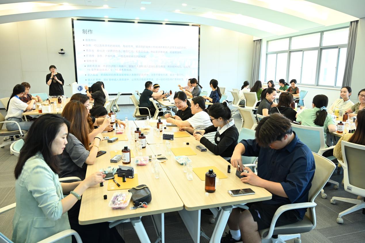 5月23日,学校工会在旭华楼推出芳香疗愈工坊活动。首场活动融合驱蚊膏制作、香包制作和养心精油调配三大体验环节。老师们在专业芳疗师带领下,开启了一场融合实用性与疗愈感的沉浸式手作之旅。