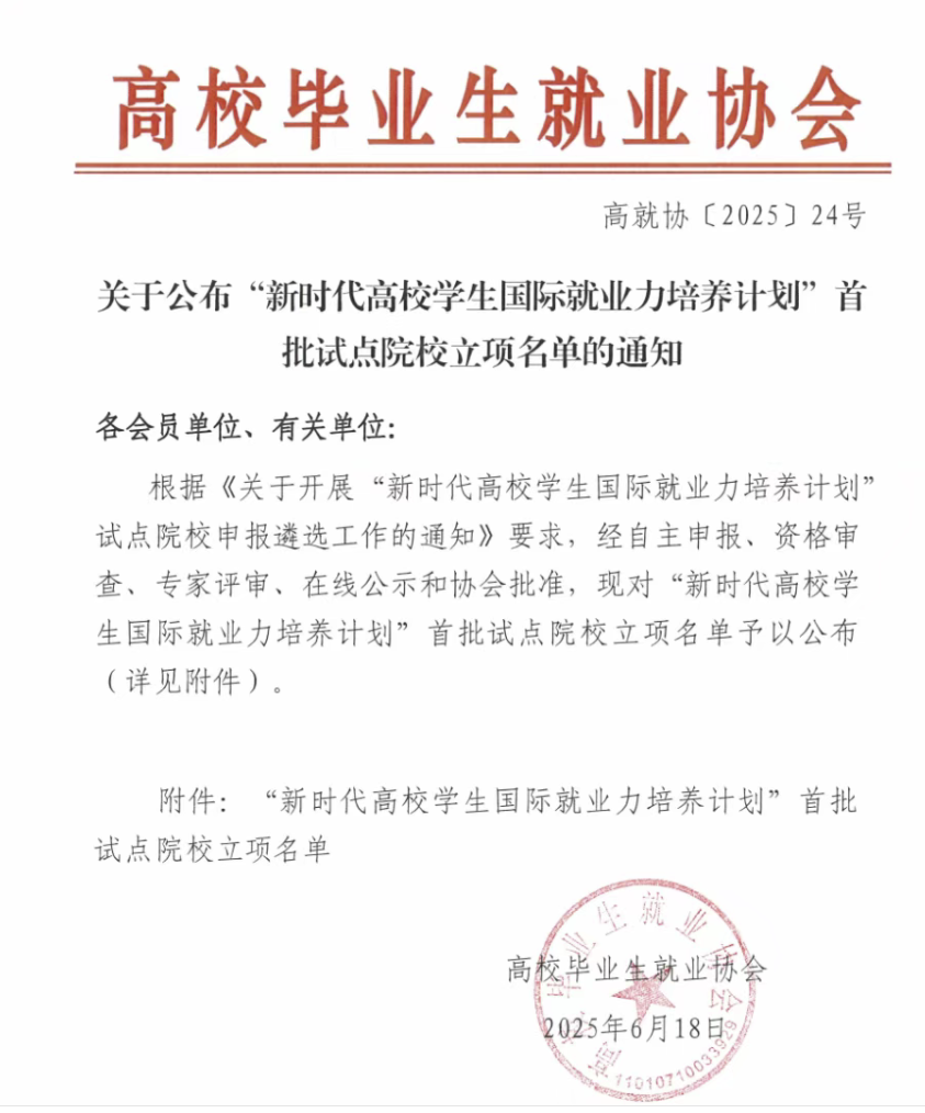 “新时代高校学生国际就业力培养计划”旨在贯彻落实《教育强国建设规划纲要 (2024-2035年)》,推进科教兴国战略和人才强国战略,创新高校人才培养模式。该计划以“促进学生就业、助力企业出海、服务国家战略”为宗旨,首批共遴选出全国60所高校作为试点院校,通过强化课程设置、开展国内外实践活动、加强师资培训和拓展国际交流与合作等方式,培育一批国际就业力标准院校,形成示范性成果,推动构建新时代高校学生国际就业力培养体系。