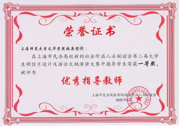 此外,天华学院因组织工作表现突出,荣获优秀组织奖;张英老师因指导学生成绩优异,获评优秀指导教师。