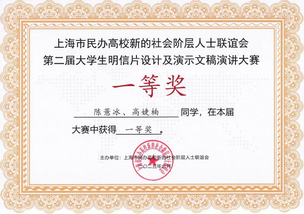 在天华学院党委统战部江芳部长的精心组织下,民办高校新联会天华分会和通识学院积极动员学生参赛,优秀教师全程指导。经过层层选拔,天华学院学生陈慧冰、高婕楠凭借出色的明信片设计和精彩的演示文稿演讲脱颖而出,荣获大赛一等奖。其作品紧扣主题,创意独特,充分展现了天华学子的艺术才华和社会责任感。